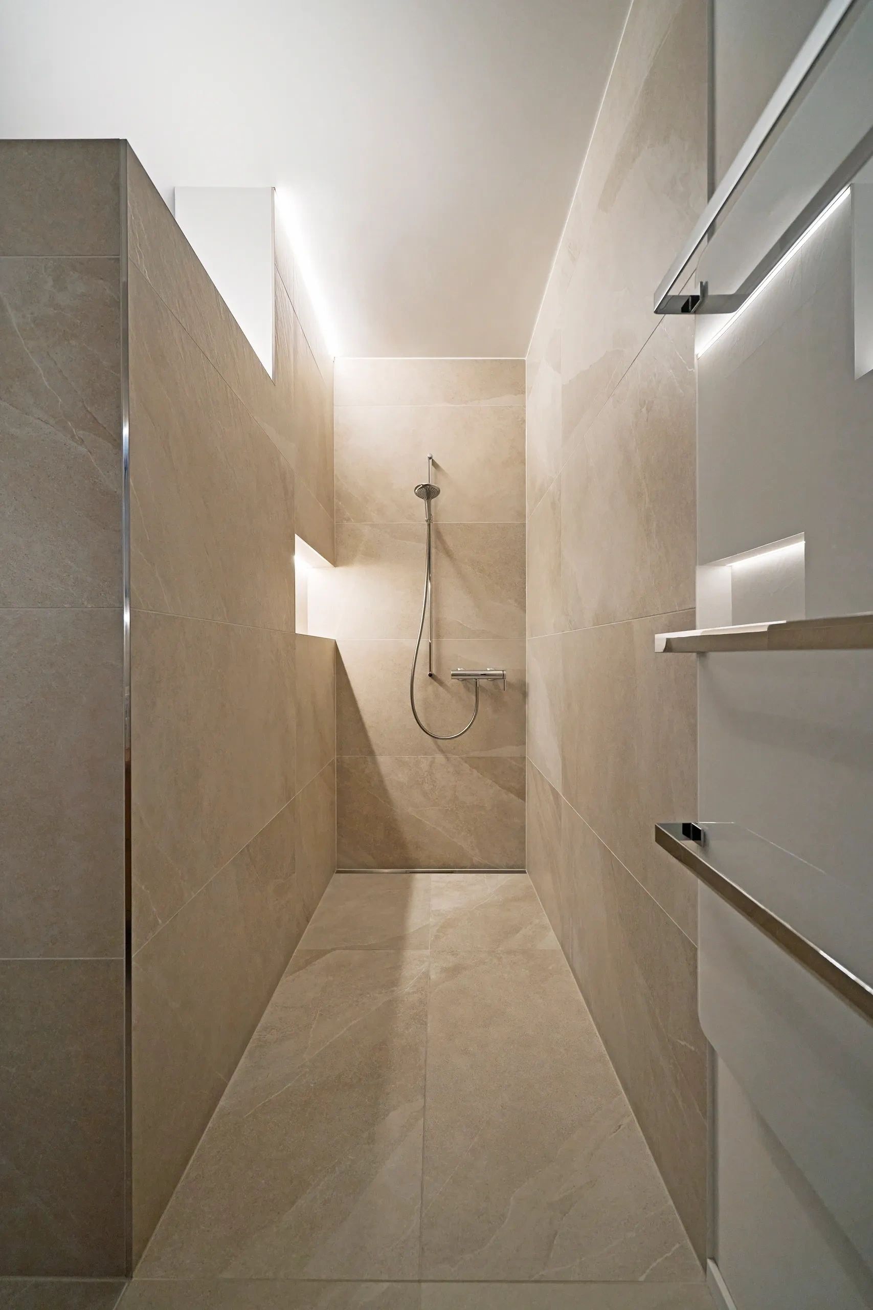 Entstanden ist eine grosszügige, bodeneben begehbare Dusche, die modernen Komfort mit zeitloser Ästhetik vereint. Eine hinterleuchtete Shampoonische sorgt für praktischen Stauraum und setzt zugleich ein stilvolles Lichtdetail. Die bisherige Badewanne wurde entfernt und durch ein neues Dusch-WC ersetzt.